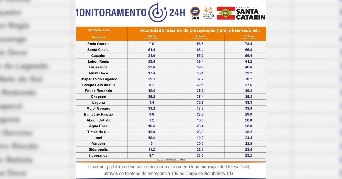 Outras cidades catarinenses registraram um alto volume de precipitação nas últimas horas. É o caso de Santa Cecília, com 66,8 milímetros, Caçador, com 56,4 milímetros, Lebon Régis, com 41,2 milímetros, e Urussanga, na região Sul, com 40,6 milímetros.