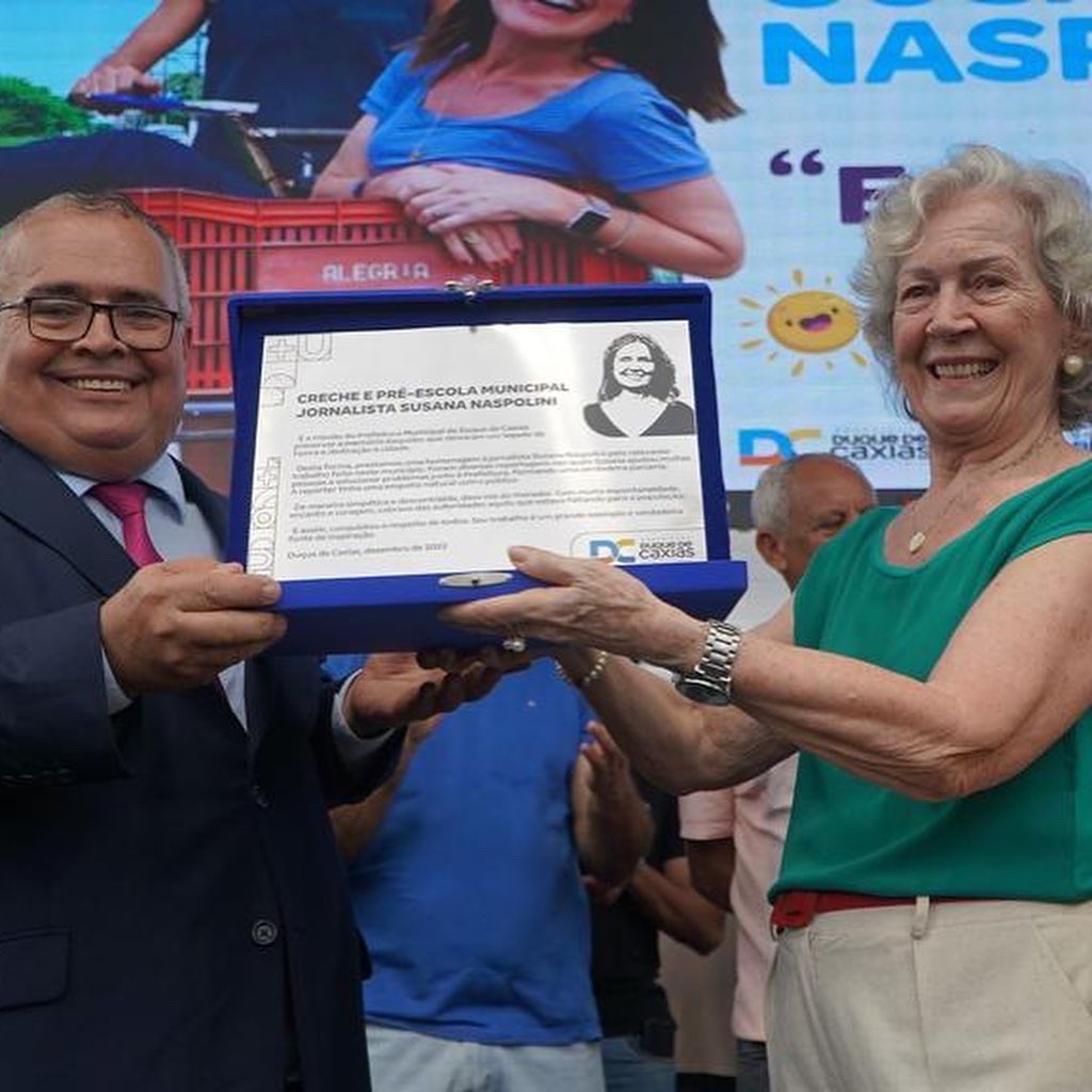 Creche e Pré-Escola Municipal Jornalista Susana Naspolini. Na manhã deste sábado (3), a obra que homenageia a criciumense foi inaugurada no bairro Campos Elíseos, em Duque de Caxias. A mãe, Maria Dal Farra; e a filha, Júlia Naspolini, estiveram na cerimônia.