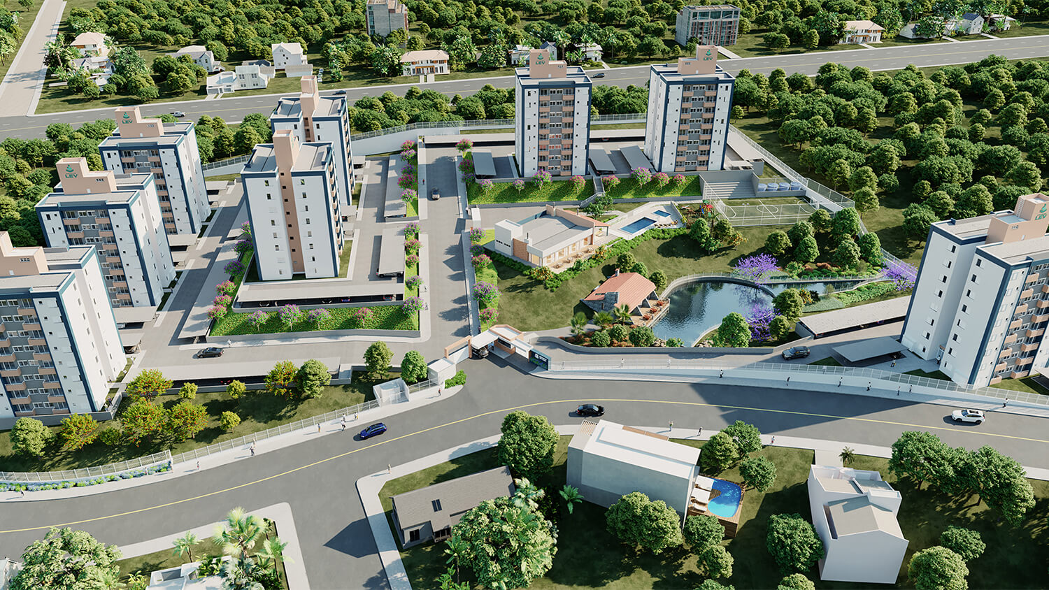 Além do lago privativo, o empreendimento conta com salão de festas, piscina adulto e infantil, playground, espaço pet, campo de futebol, salão de festas garden, quiosque com churrasqueira, vagas de garagem para visitantes, pórtico de entrada com guarita.
