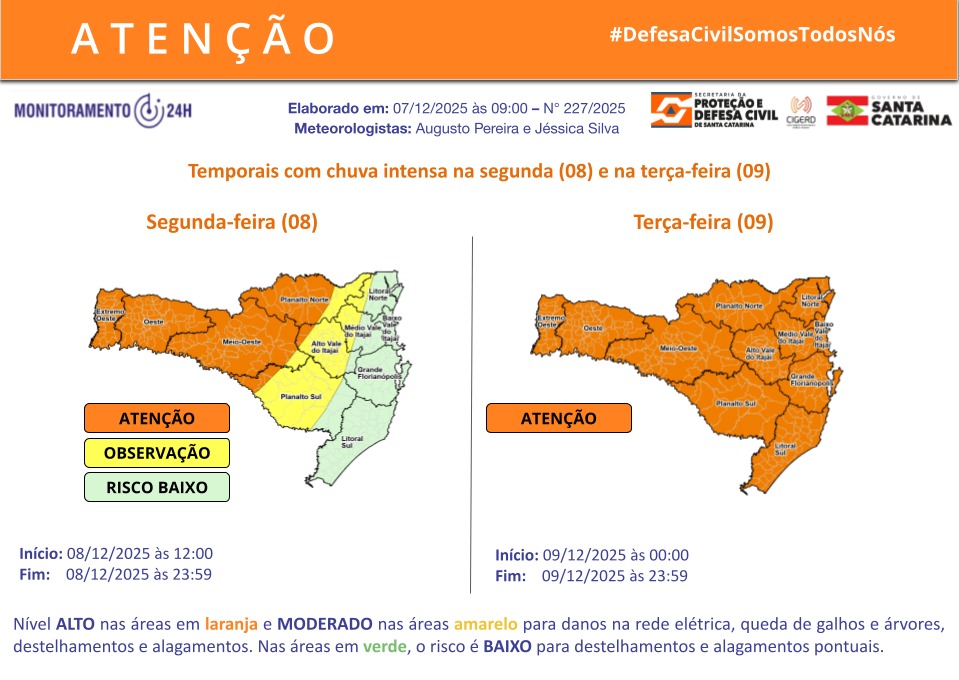 Com o avanço do ciclone na terça-feira (09), as instabilidades ganham força em todo o estado. A previsão indica chuva persistente desde a madrugada, com risco alto para alagamentos e enxurradas, especialmente no Litoral e Vale do Itajaí. Nas regiões costeiras, as rajadas de vento podem chegar aos 70 km/h, enquanto o mar deve ficar mais agitado, também conforme a Defesa Civil.