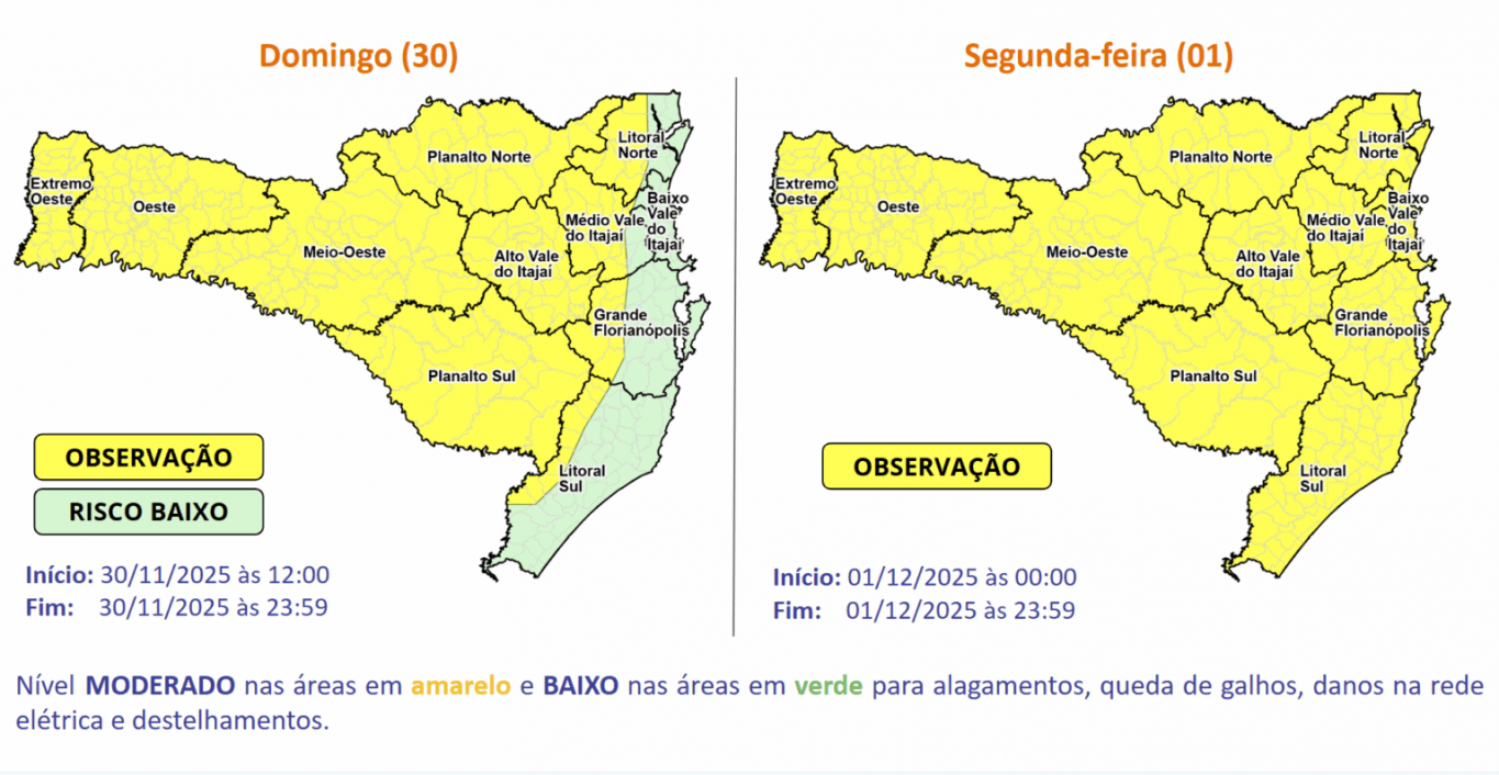 Apesar do baixo risco para o final de semana no Sul, o estado pode registrar temporais isolados a partir da tarde deste domingo. O risco amplia para todo o estado na segunda-feira (01), em todo o estado, incluindo a região Sul.