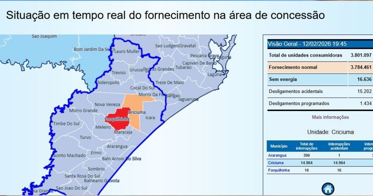 Um temporal com menos de meia hora de duração, na noite desta quinta-feira (12), deixou cerca de 15 mil unidades consumidoras sem energia em Criciúma. A maior parte das residências afetadas está localizada no Distrito de Rio Maina, com 2.764.