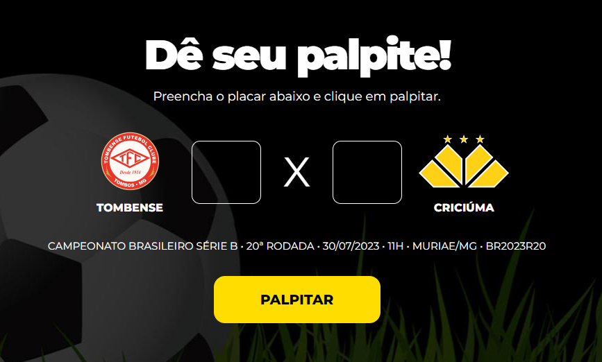 Tombense e Criciúma se enfrentam neste domingo (30), às 11h, no Estádio Soares de Azevedo, pela 20ª rodada da Série B do Campeonato Brasileiro. Mais uma vez, os torcedores podem participar do Bolão do Bistek. A iniciativa, do Timaço da Som Maior Comunicação e do Bistek Supermercados, vai premiar o vencedor com uma picanha Raças Britânicas da Casa de Carnes Bistek.