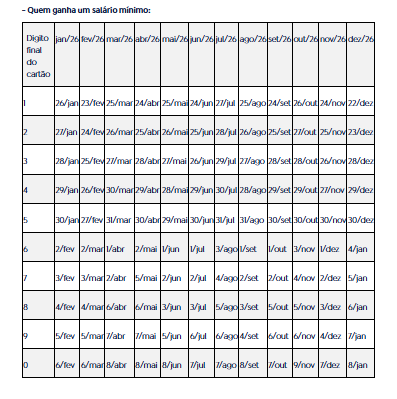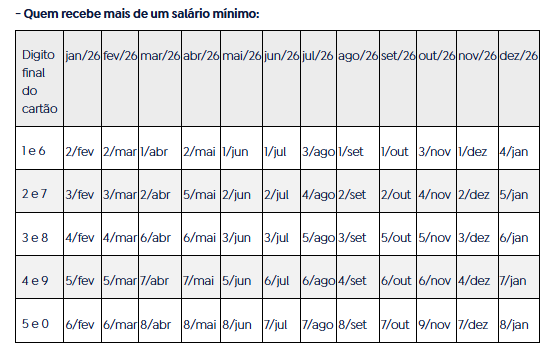 O cronograma segue o modelo dos anos anteriores, com datas diferenciadas para quem recebe um salário mínimo e para aqueles com benefícios acima desse valor. Para cada grupo, o pagamento é determinado pelo número final do cartão, sem considerar o dígito verificador que aparece após o traço.