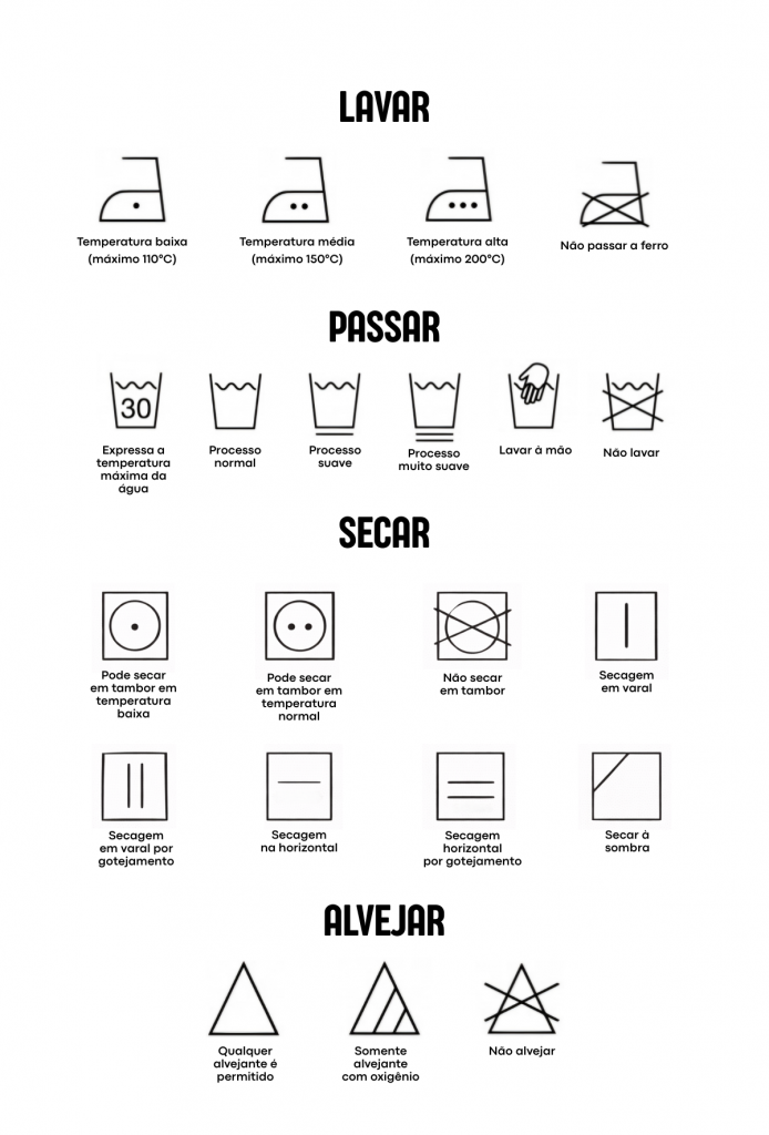 - Instruções de conservação: orientações sobre lavagem, alvejamento, secagem e passadoria;